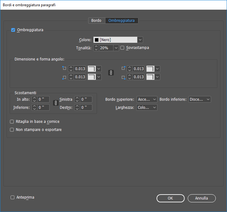 specificate la larghezza dell’ombreggiatura. Selezionando Colonna, l’ombreggiatura si estende sulla cornice di testo, selezionando Testo, l’ombreggiatura si estende sul testo.