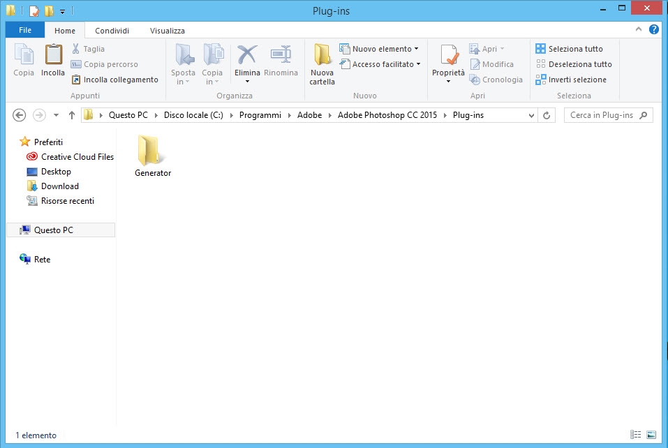 - Spostate il plug-in dalla cartella dei plug-in di Photoshop in una posizione temporanea esterna a tale cartella (ad esempio, una nuova cartella sul desktop).