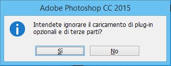 Tenete premuto il tasto Maiusc e avviate Photoshop. All’avvio, viene visualizzato il messaggio “Intendete ignorare il caricamento dei plug-in opzionali e delle terze parti?”