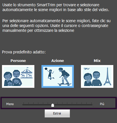 SmartTrim analizza automaticamente la clip e seleziona le migliori scene sulla base di uno delle tre seguenti impostazioni predefinite per i video.