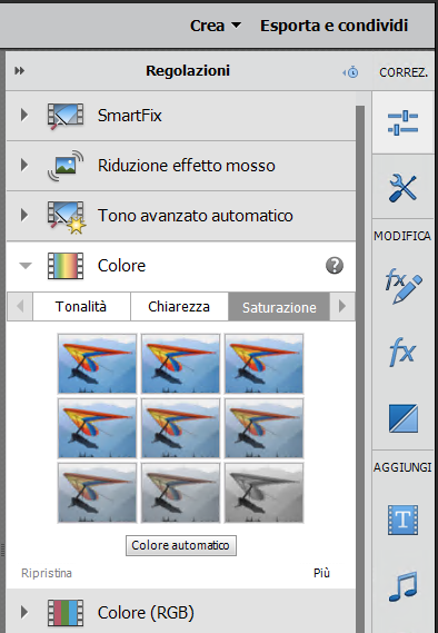 Seleziona Colore dal pannello Regolazioni e seleziona l'opzione Tonalità, Luminosità e Saturazione appropriata dall'elenco delle impostazioni predefinite disponibili.