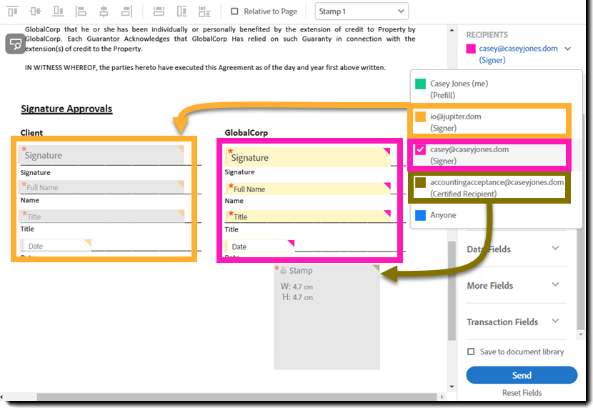 - Ogni destinatario nell’elenco DESTINATARI ha un proprio colore accanto al suo nome, e lo stesso colore compare in alto a destra in ogni campo che gli è stato assegnato.