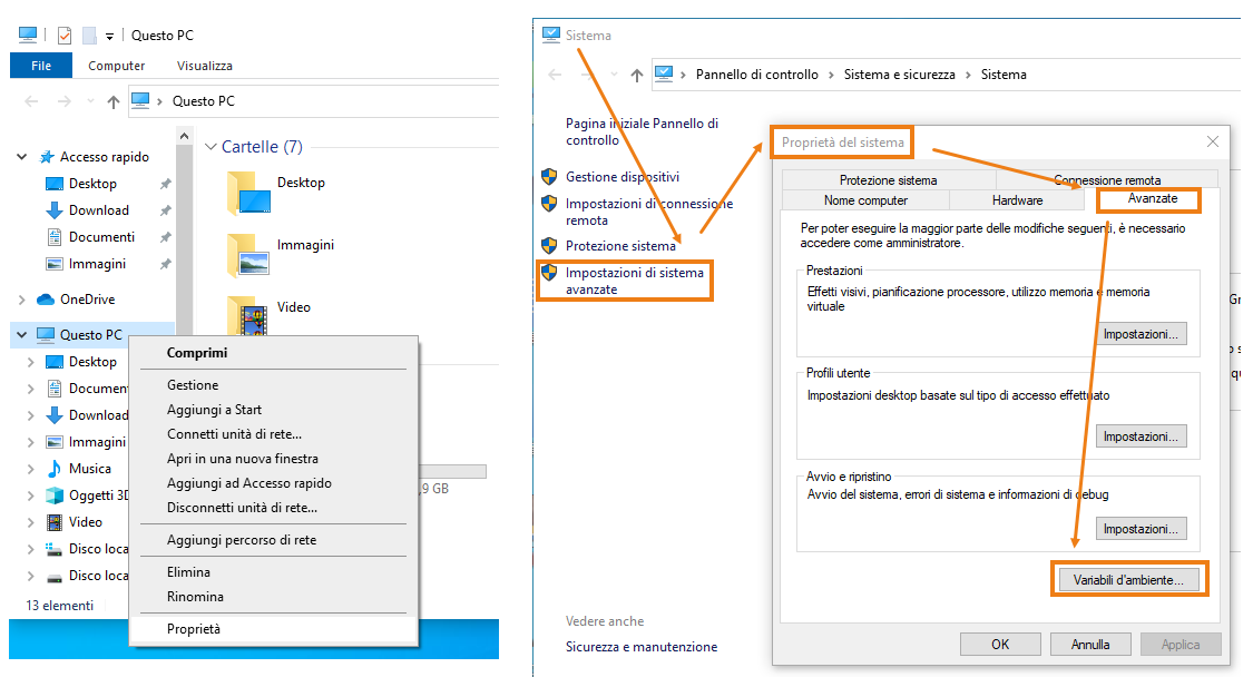 Nella finestra di dialogo Proprietà di sistema seleziona la scheda Avanzate e fai clic su Variabili d’ambiente.