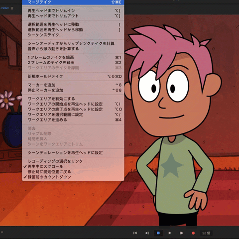 選択した複数のリップシンクまたはトリガーを組み合わせて、タイムライン内の垂直領域を使用しないようにします。「マージテイク」を参照してください。