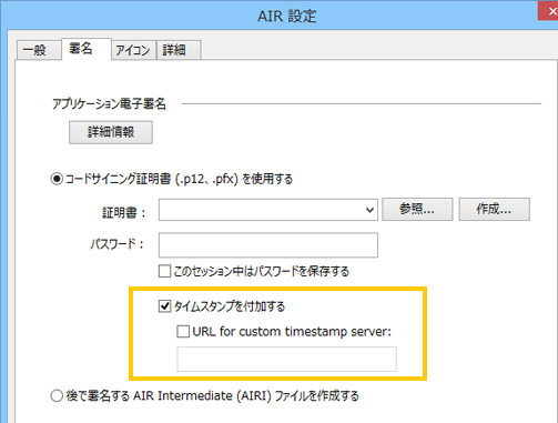 AIR - アプリケーションとインストーラーの設定ダイアログボックスの「署名」タブでは、アプリケーションのコード署名証明書を指定できます。
