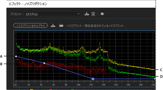 A. コントロールポイントをドラッグして周波数範囲によってリダクションを変更 B. 低振幅ノイズ C. 高振幅ノイズ D. このしきい値を下回るとノイズリダクションが発生