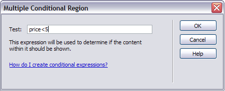 例えば、アイテムが入手できない場合に、そのアイテムの価格の横に「ご利用できません」と表示するときは、ページで「ご利用できません」と入力し、そのテキストを選択して、選択したテキストに条件領域を適用します。Dreamweaver によって選択範囲が <xsl:if> タグで囲まれ、データが条件式の条件に一致する場合のみ、このテキストがページに表示されます。