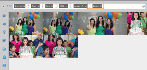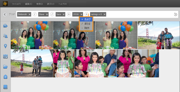 これらの人物のほかに検索対象を広げ、重要度が 3 以上の画像という条件も含めると、検索結果が更新され、指定した人物が 1 人以上写っており、かつ、重要度が 3 以上というメディアファイルだけが表示されます。例えば、デボラが写っていても、重要度が 2 であれば、そのメディアファイルは表示されません。