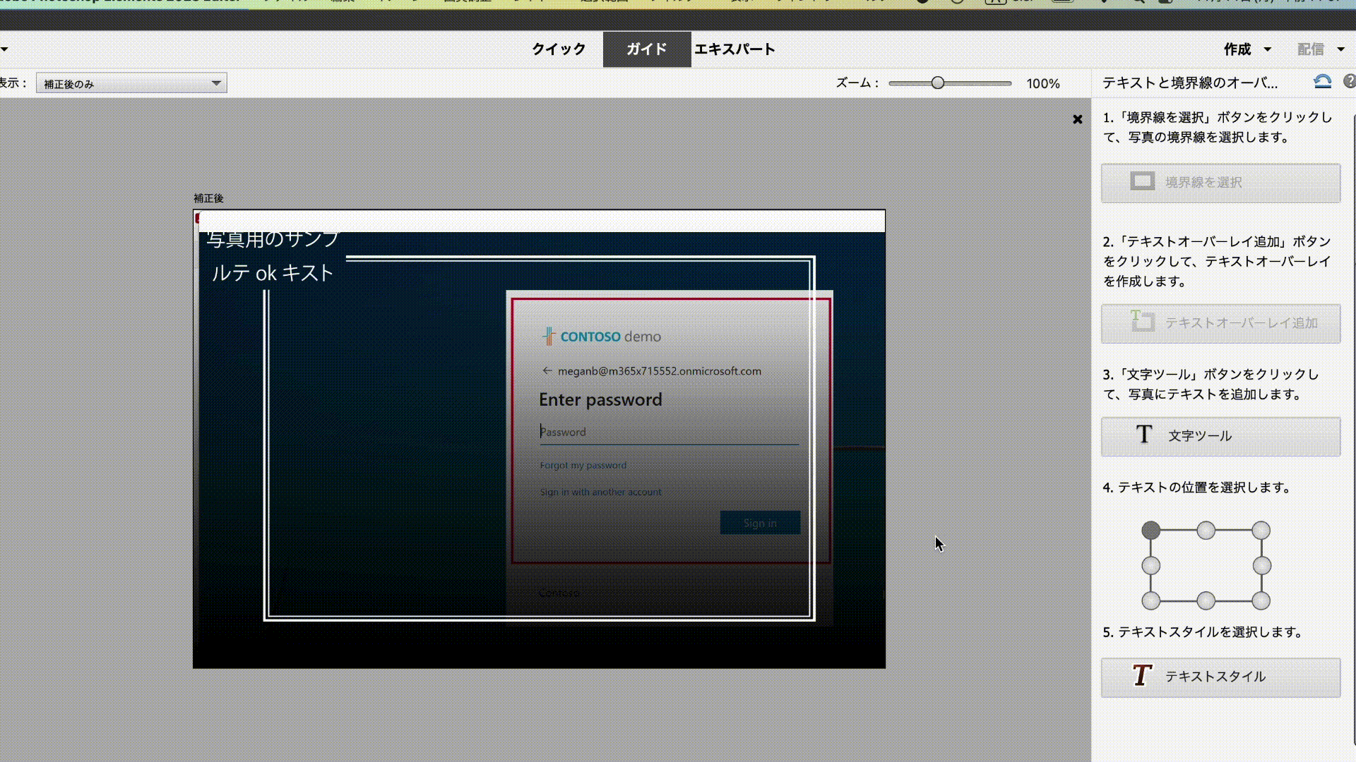 新しいテキストを入力します。 ガイド付き編集のワークスペースのツールオプションバーでテキストのフォント、サイズ、カラー、スタイルを変更できます。 入力が終わったら、緑色のチェックマーク(
