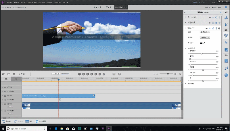 適用されたエフェクトパネルで、キーカラーのスポイトツールを選択します。プレビュー画面の上にマウスポインターを置き、空の色を選択して透明にします。