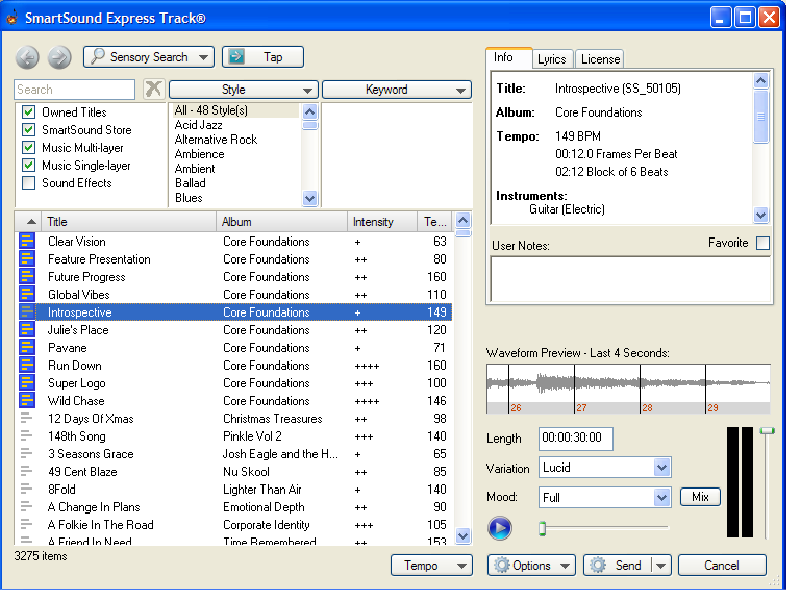 SmartSound Express Track ダイアログでは、青いアイコンの付いたファイルが無料で使用できるファイルです。アプリケーションの左上にある SmartSound Store のチェックを外すと、これらのファイルを表示できます。