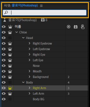 1. [퍼펫] 패널에서 레이어 목록 위에 있는 검색 필터 필드를 클릭합니다. 패널에 포커스가 맞춰지면 [편집] > [찾기](Command/Ctrl+F)를 선택할 수도 있습니다.