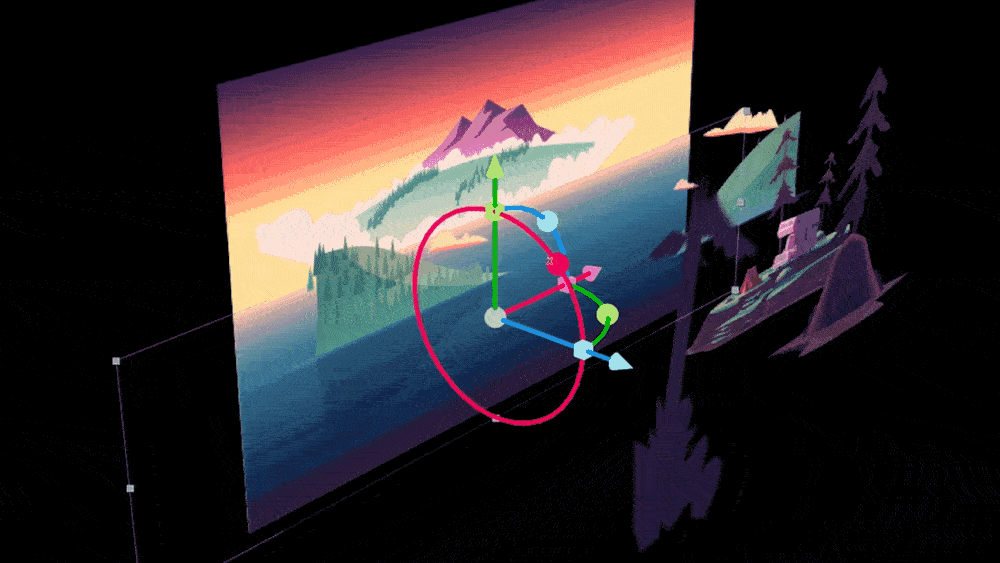 3D 변형 기즈모를 사용하여 단일 도구 내에서 3D 레이어의 비율과 위치를 조정하고 회전할 수 있습니다. 이전의 변형 기즈모와는 다르게, 이 도구는 더 빠르고 직관적이며 모든 공간 조작 도구를 하나로 제공합니다. 작동 원리는 동일한 도구 내에서 각 축을 변형할 수 있는 차원과 유사합니다. 위치, 크기 조절, 회전 등 별도의 속성으로 이동하여 조작할 필요가 없습니다.
