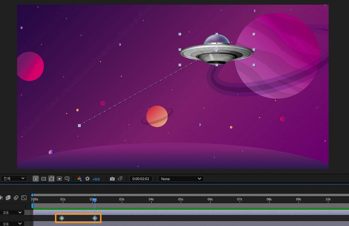 [레이어] 패널에서 두 키프레임 사이의 거리를 조정하여 애니메이션 속도를 변경할 수 있습니다. 한 키프레임을 더 멀리 옮기면 속도가 빨라지고, 서로 가깝게 조정하면 속도가 느려집니다.