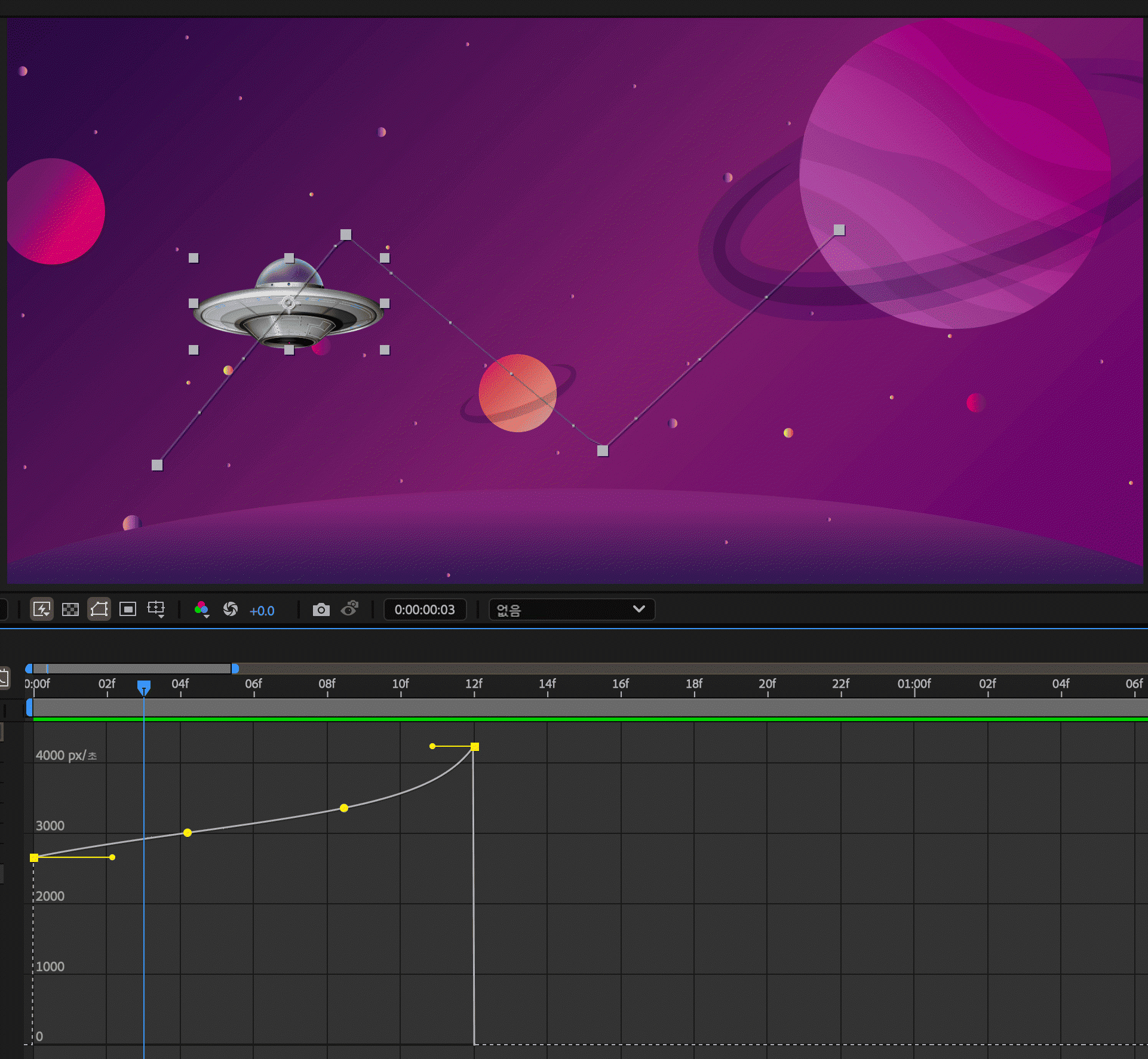 타임라인에서 중간 키프레임의 위치가 조정되어 시작 및 종료 키프레임 사이의 속도 곡선을 매끄럽게 합니다.