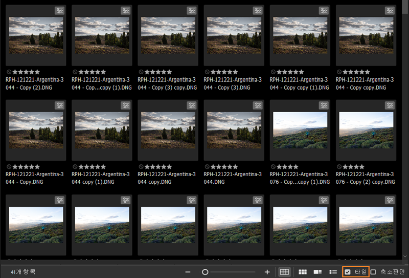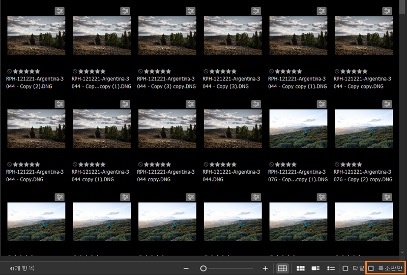 - 이제 콘텐츠 패널의 맨 아래에 있는 보기 옵션 옆에는 축소판만 확인란이 표시됩니다. 별점 매기기, 파일 이름 및 기타 세부 정보를 숨기려면 이 옵션을 사용하십시오. 이렇게 하면 콘텐츠 패널에서 각 파일 간의 간격이 줄어들고 가독성이 향상됩니다.