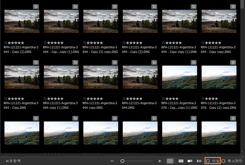 - 또한 콘텐츠 패널 하단에는 타일 확인란도 있습니다. 기본적으로 타일 옵션이 선택되어 있으며 이에 따라 Bridge 콘텐츠 패널에 모든 자산에 대한 타일이 표시됩니다. [타일] 옵션을 선택 해제하면 자산 타일이 더 크게 표시되어 빈 공간을 채웁니다. 격자 보기, 축소판 보기, 세부 사항 보기, 목록 보기와 같은 모든 유형의 보기에서 타일을 비활성화할 수 있습니다.