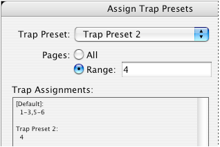 트랩 페이지 범위를 사용하지 않으려면 패널 메뉴에서 [트랩 사전 설정 할당]을 선택하고 페이지 범위를 입력한 다음 [트랩 사전 설정] 메뉴에서 [트랩 사전 설정 없음]을 선택합니다. [할당]을 클릭한 다음 [완료]를 클릭합니다.