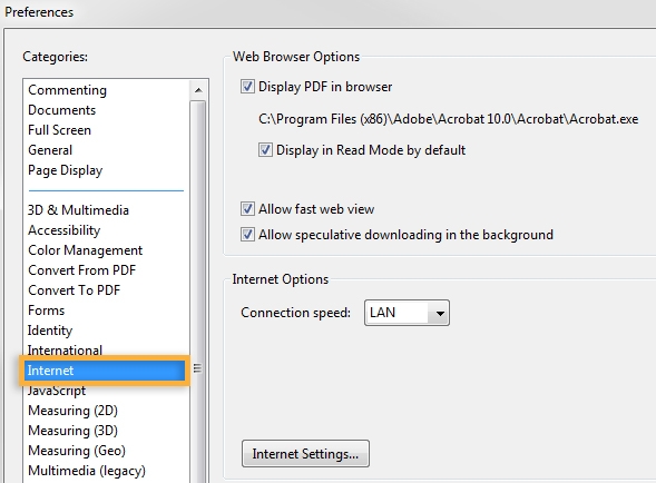 إعادة تعيين التفضيل عرض PDF في المستعرض (Acrobat/Reader X أو أقدم)