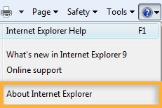 في Internet Explorer، اختر تعليمات > حول Internet Explorer. (في بعض إصدارات Internet Explorer، حدد علامة الاستفهام في الجانب الأيمن العلوي لتحديد حول Internet Explorer).