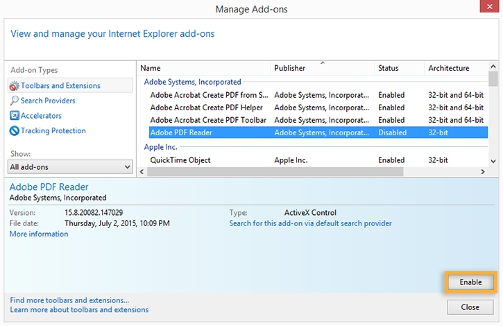 تمكين وظيفة Adobe PDF الإضافية في المستعرض (Internet Explorer 8 والإصدارات الأحدث)