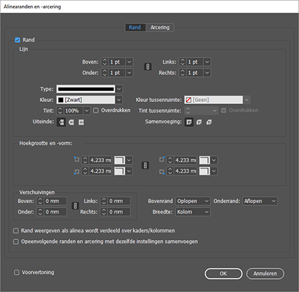 - Kies in het vervolgmenu van het deelvenster Alinea (Venster > Tekst en tabellen > Alinea) de optie Alinearanden en -arcering.