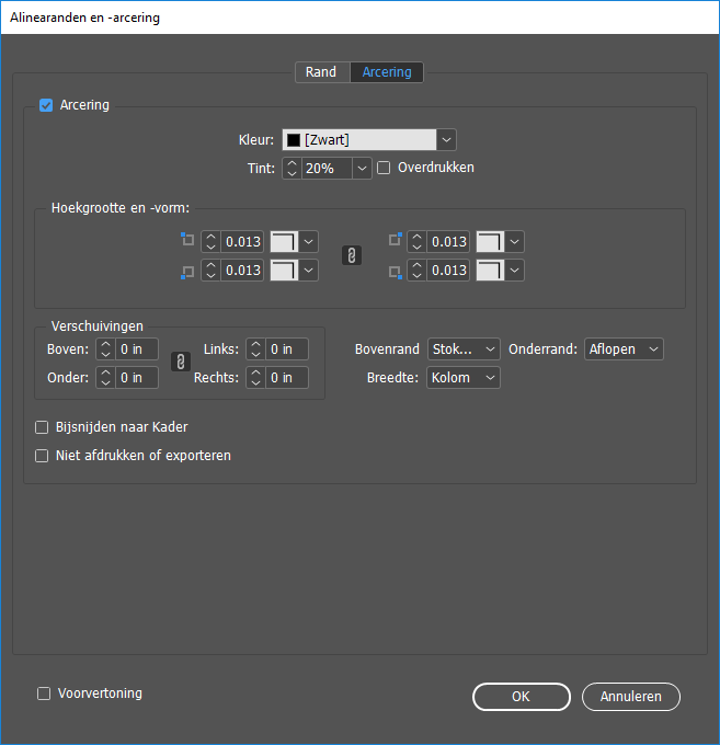 Selecteer deze optie om de arcering naar de randen van het kader bij te snijden.