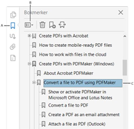 Bokmerker inneholder en innholdsfortegnelse som vanligvis viser kapitler og underkapitler i et dokument. Bokmerker vises i navigasjonsruten.