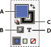 Fargetemaverktøy – valg A. Klikk for å vise alle temaer B. Legge til det aktuelle fargetemaet i fargeprøver C. Lagre i det aktive CC-biblioteket
