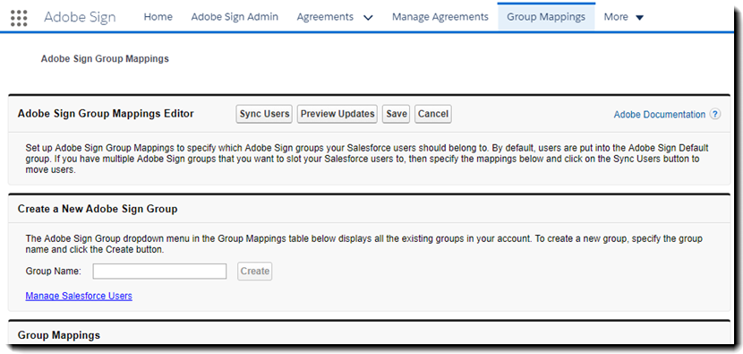 Salesforce-brukere i disse profilene, som ikke er Adobe Sign-brukere, påvirkes ikke av denne synkroniseringen. Alle nye brukere som ble opprettet ved bruk av Adobe Sign for Salesforce, vil også opprettes automatisk i riktig gruppetilordning basert på de lagrede tilordningene det er merket av for Synkroniser utvalg.