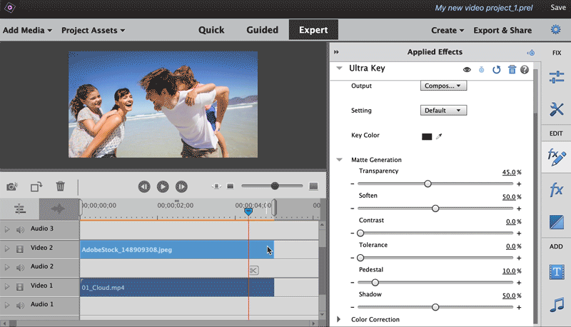 7. Click the effects icon on the right pane to open video effects. Drag-and-drop the ultra key effect onto the photo on the Video 2 track in the timeline.