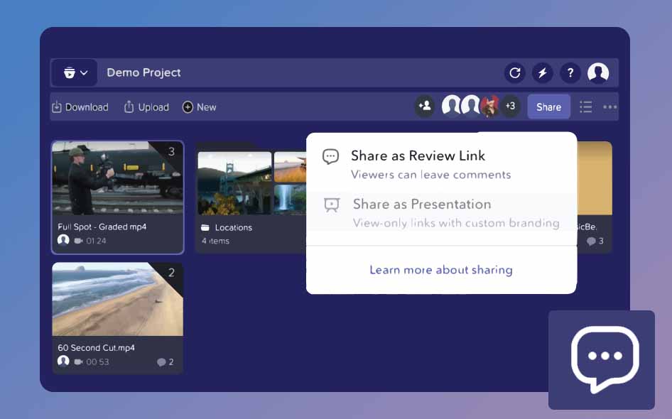 Share your work for review and receive timestamped comments and annotations.