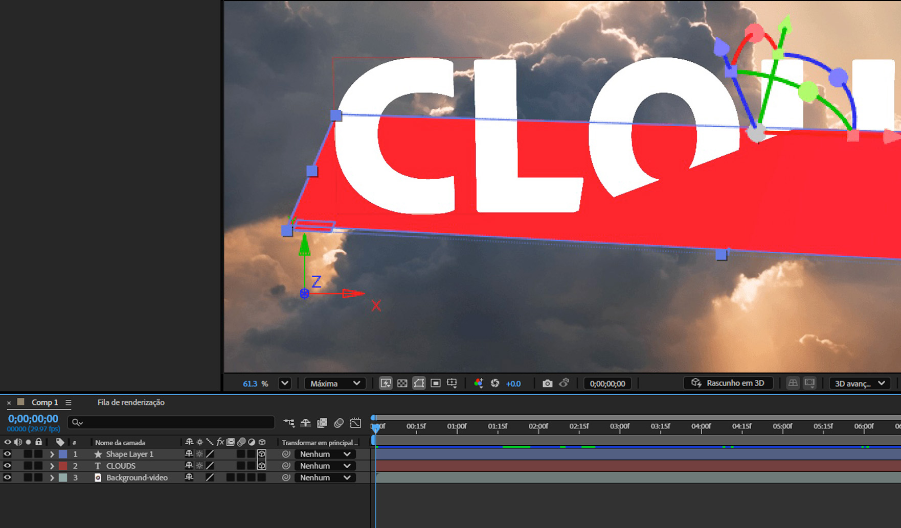- No painel Composição, use a ferramenta Seleção para arrastar a ponta da seta do controle da camada do eixo 3D correspondente ao eixo ao longo do qual você deseja mover a camada.Com a tecla Shift pressionada, arraste para mover a camada mais rapidamente.