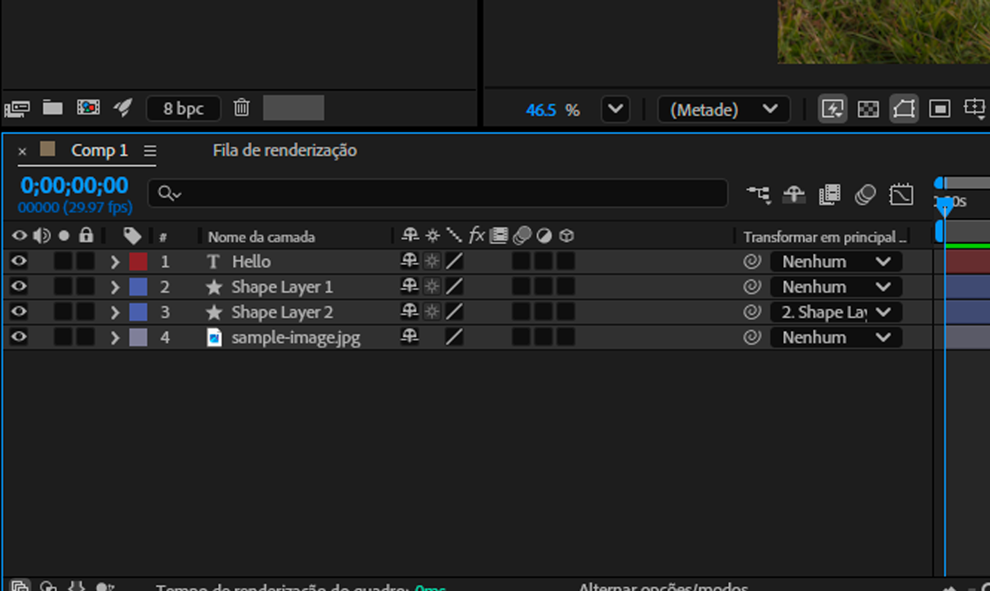 Para sincronizar alterações feitas em camadas atribuindo as transformações de uma camada a outra camada, use o recurso de pai. Depois que uma camada tornada um pai de outra camada, a outra camada é de camada filho. Quando você atribui um pai, as propriedades de transformação da camada filho são relativas à camada pai em vez da composição. Por exemplo, se uma camada pai mover 5 pixels à direita da sua posição inicial, a camada filho também move 5 pixels à direita da sua posição. O recurso Pai é semelhante ao agrupamento; as transformações feitas a um grupo são relativas ao ponto de ancoragem do pai.