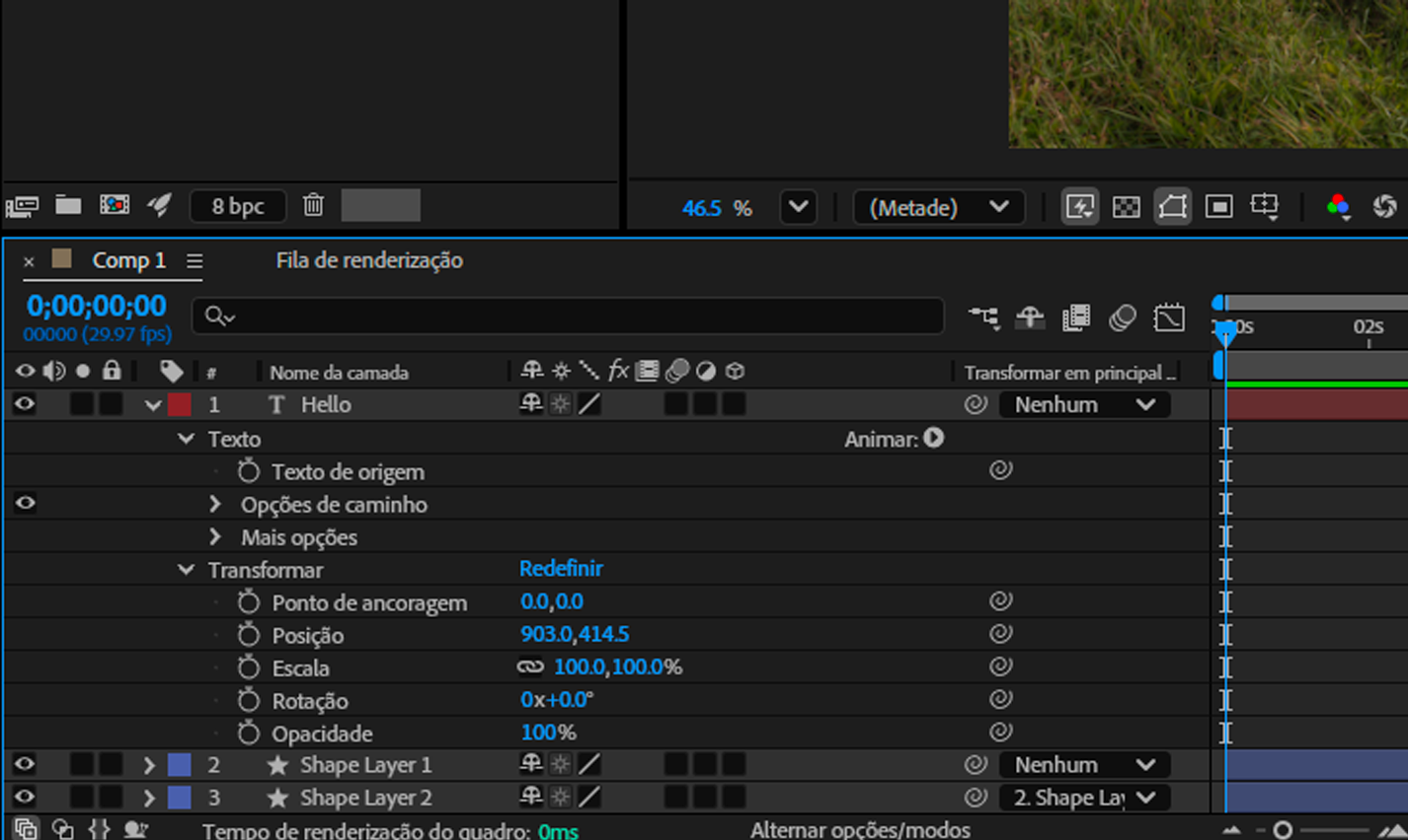 O uso de principais e secundários afeta todas as propriedades de transformação, como Posição, Dimensionamento, Rotação e Orientação (para camadas 3D), mas não Opacidade.