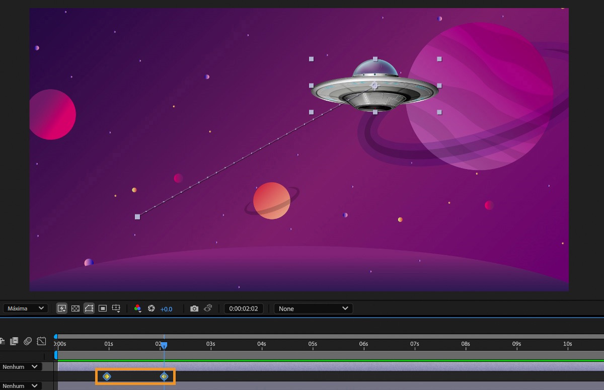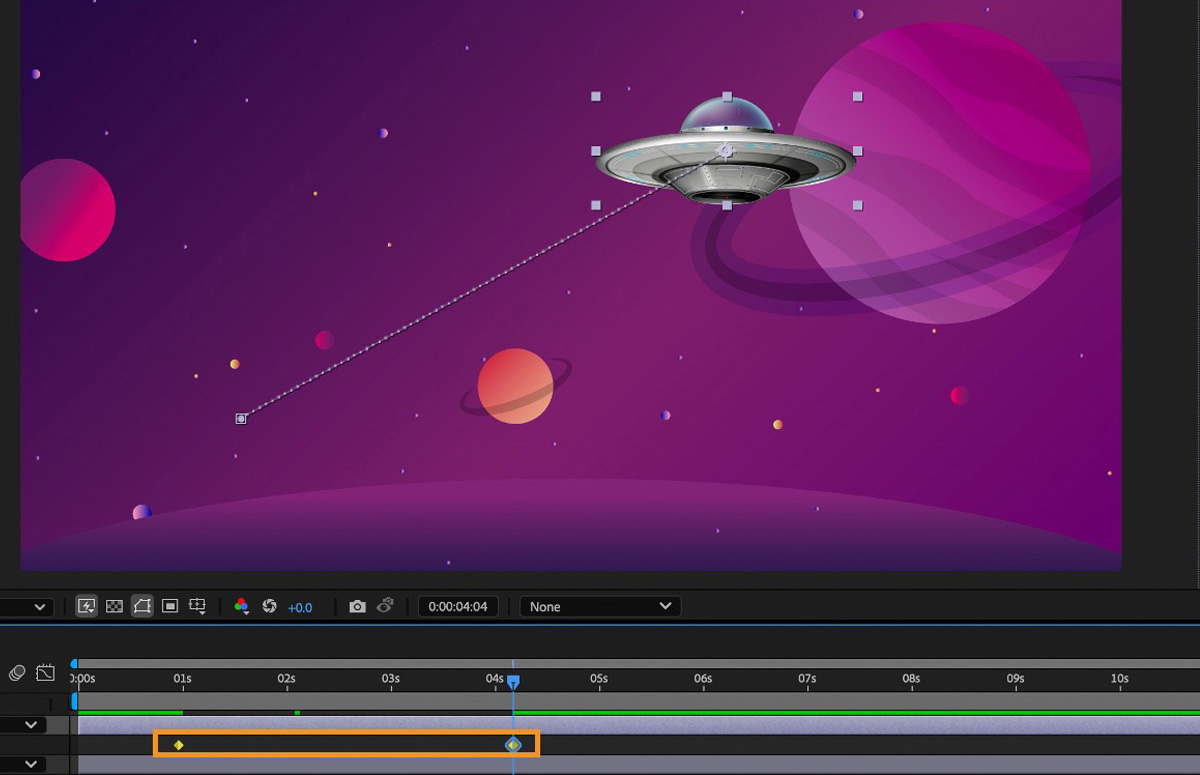 - No painel Composição ou Camada, ajuste a distância espacial entre dois quadros-chave no caminho do movimento. Aumente a velocidade, movendo um quadro-chave para longe do outro, ou diminua a velocidade, movendo a posição de um quadro-chave para mais perto do outro.