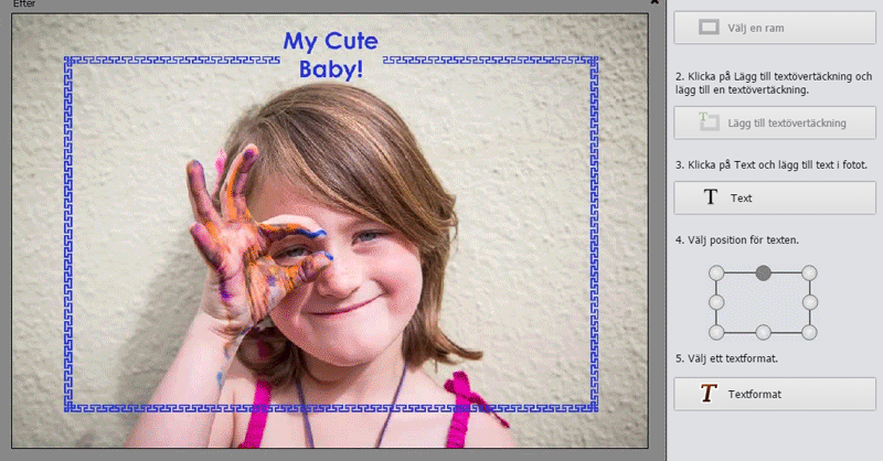 Lägg till snygga ramar i fotot med text som passar budskapet. Med den guidade redigeringen Text- och ramövertäckning kan du snygga till fotot med en kombination av fina ramar och text.
