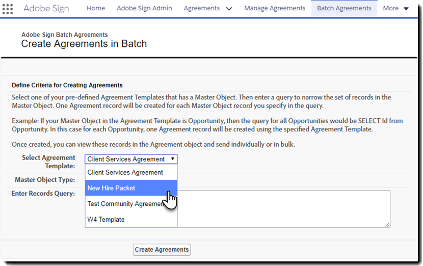 Om du använder v18 eller senare av Adobe Sign för Salesforce-paketet är det första steget i att hantera flera avtal åt gången att visa knappalternativen ovan. (Version 19 har följande alternativ konfigurerade som standard)