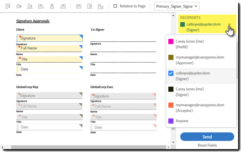 Det kan vara besvärligt att komma ihåg rollen för signeraren i den ordning som du anger i fältet Till: på fliken Skicka.