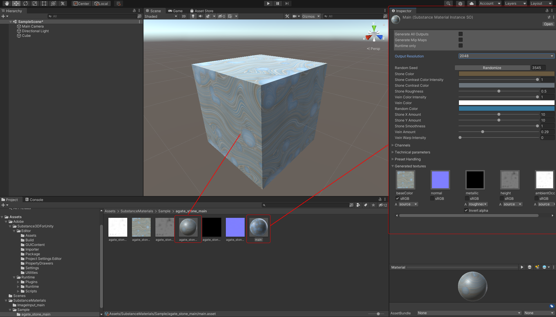 - The sbsar asset will create a main import file and a folder containing the output textures and a generated Unity material.