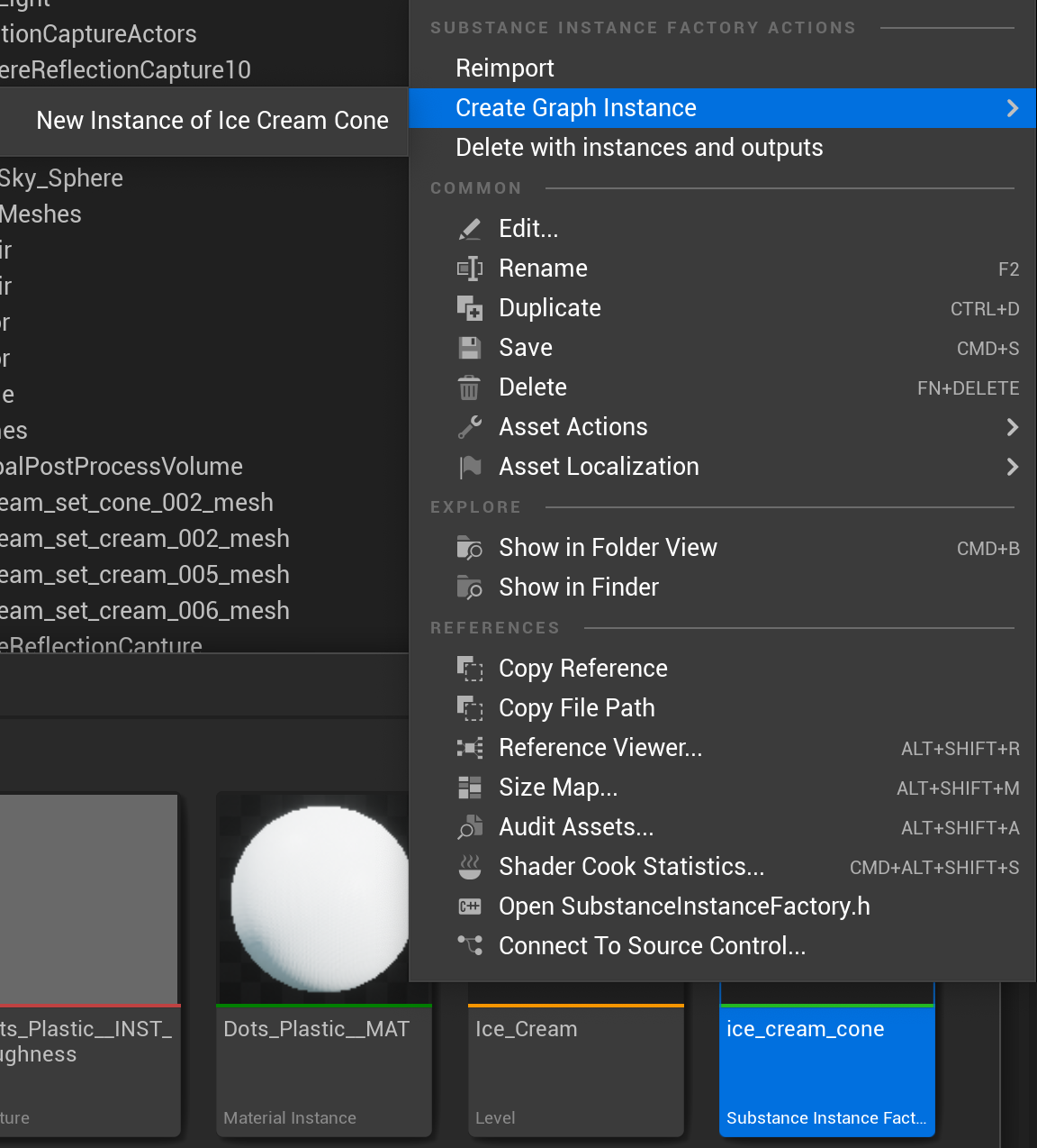 Right-click on the substance created UE5 material and choose "Create Material Instance." This creates a UE5 Instance material.