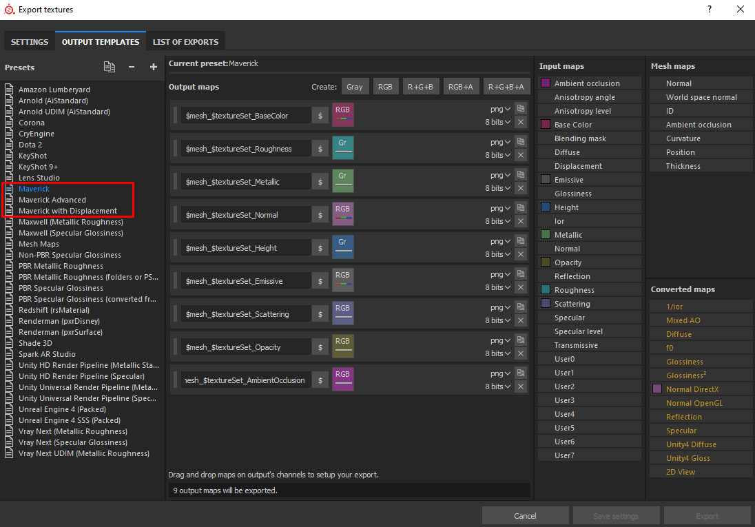 Choose “Maverick with Displacement preset” if your model has a relevant displacement map. This preset will export the height map in 32-bit for Maverick to capture all the high-quality geometry details.
