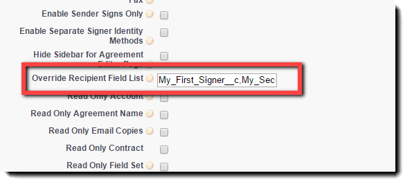 8. Edit this setting to contain a list of comma-separated API field names from the agreement record. The field names should be in order and represent the fields the recipients should be read from. (e.g., My_First_Signer__c,My_Second_Signer__c)