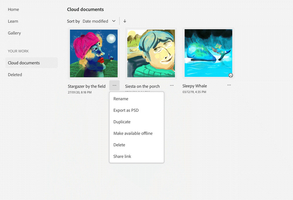 在 Adobe Fresco,您的文件會自動在雲端儲存。 要檢視您的雲端文件,請點選主畫面上「您的檔案」標籤。 您的雲端文件會完全真實地儲存。 雲端文件讓您享有方便和優質。