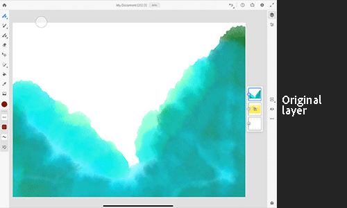 - 您可以在圖層和圖層遮色片之間滑動,查看遮色片編輯對圖層的影響。如果要從圖層遮色片切換到圖層,請在圖層遮色片縮圖上向右滑動。這樣可以使圖層 (而不是圖層遮色片) 進入啟用狀態,讓您可以編輯繪圖。圖層縮圖會變成顯示和啟用狀態,縮圖右側會出現小黑點。
