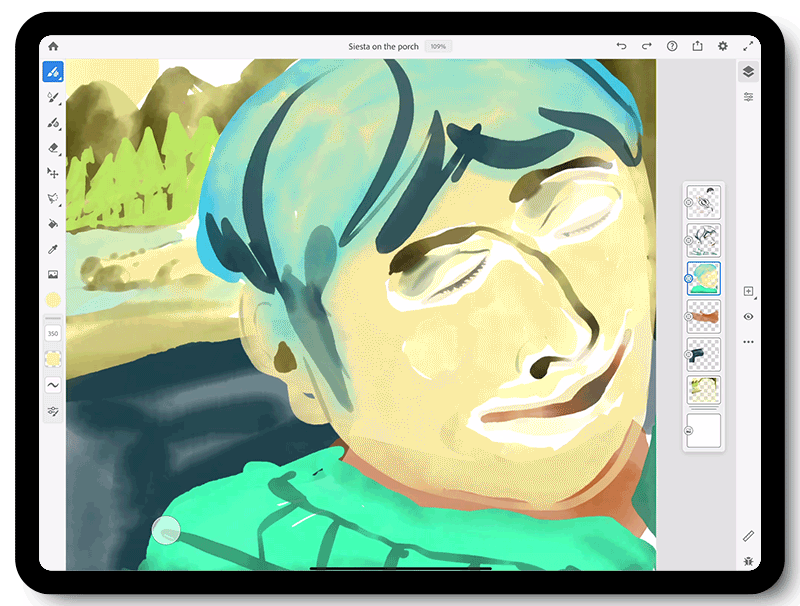 在 Adobe Fresco 中,您可以使用各種各樣的操作來處理圖層。 例如,您可以輕鬆地隱藏圖層,專注處理該圖層以外的所有圖層元素。或者您可以輕鬆地重新排列圖層,將作品的某些元素移動到前景或背景。