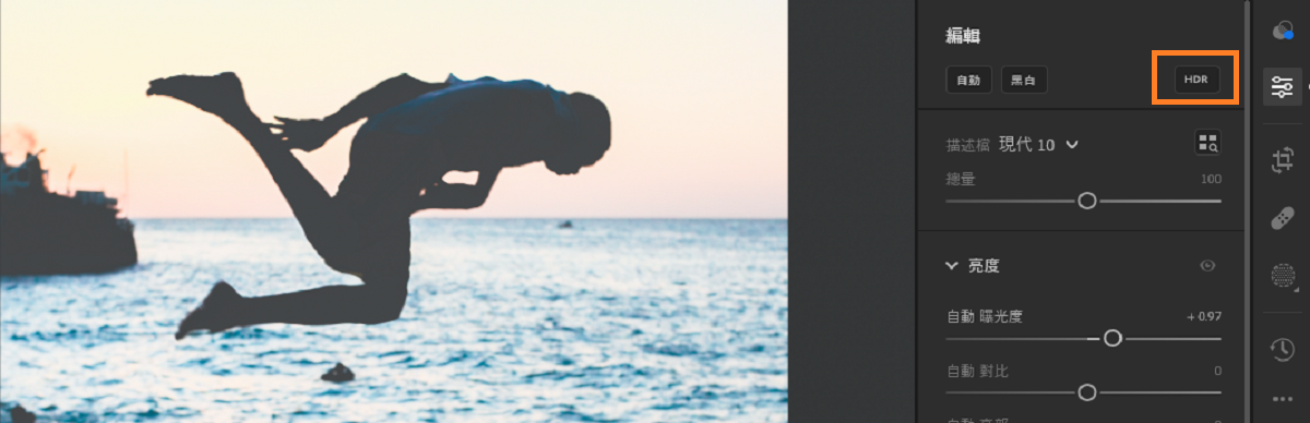 「編輯」面板中的大部分選項在 SDR 與 HDR 模式中的運作方式都類似。 但它們可能分別需要使用不同的設定,才能達到最佳外觀效果。